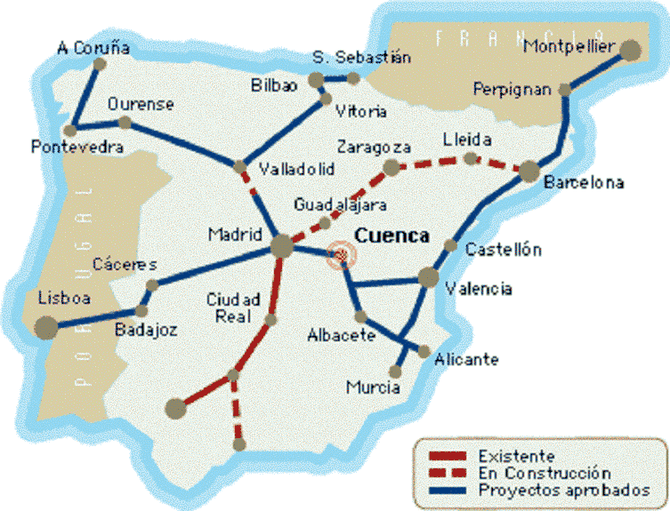 Eixe sería un bon traçat, encara que el prioritari deuria ser el de l’Arc Mediterraneu. Cal un AVE que enllace a Almeria, Murcia, Valencia, Catalunya, França i Italia. Molta gent creu erroneament –per influencia de la tradicio manipuladora catalanufa- que l’Arc Mediterraneu es correspon en els territoris de l’antiga Corona d’Arago. I aixo no és cert, ya que l’Arc Mediterraneu està conformat per la costa mediterranea d’Espanya, França i Italia (que té forma d’arc). Un AVE que mos conecte en Europa deuria ser el nostre objectiu numero u.