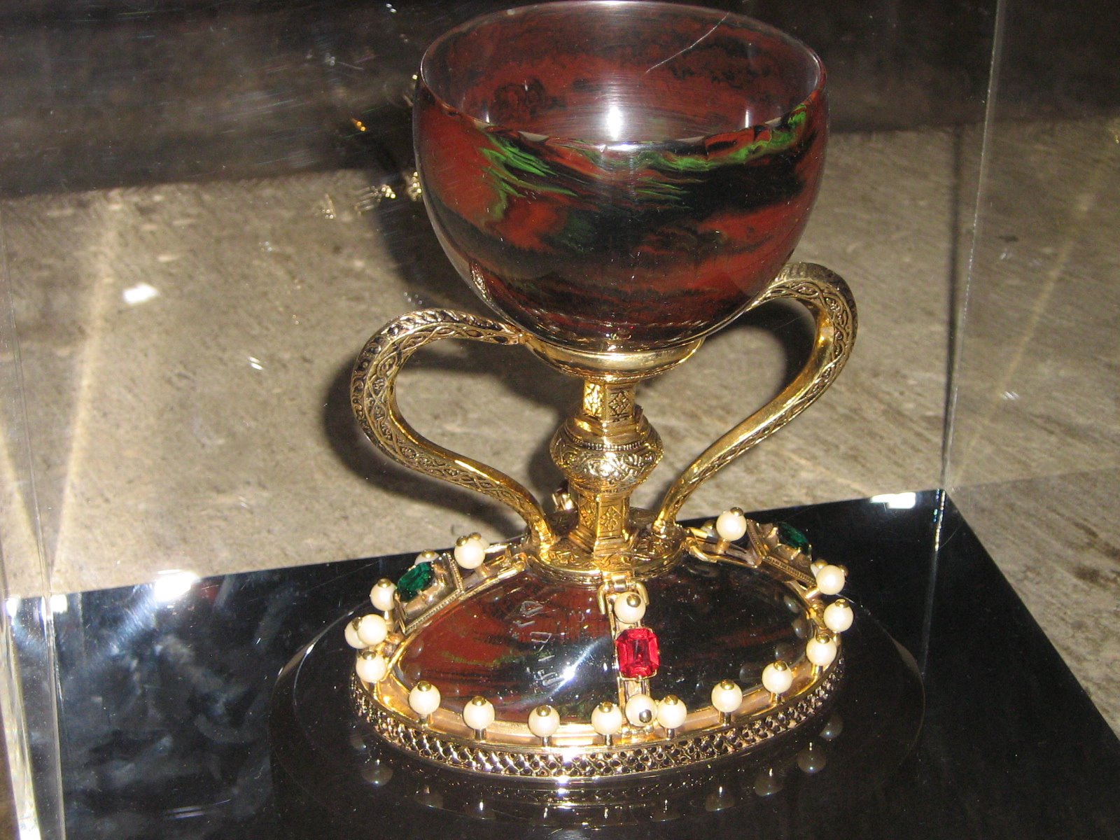 ¿Cómo es la copa? Hay dos elementos diferenciados como son una copa tallada en piedra de calcedonia, ágata o cornalina oriental, de siete centímetros de altura y nueve y medio de diámetro, que sería de la época de Jesús, y un pie de orfebrería con asas y piedras preciosas que es el relicario que se añadió en siglos posteriores para resaltar la pieza principal.