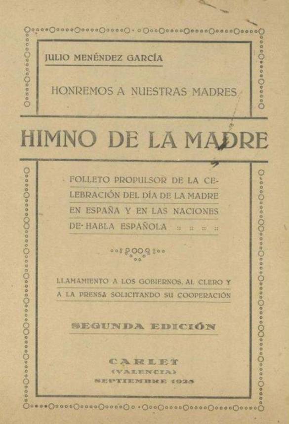En España el Día de la Madre se celebra el primer domingo de mayo desde 1965, pero nunca se ha declarado día oficial. En 1925 el poeta valenciano Juli Menéndez García publicaba su Himno de la Madre, un folleto en el que impulsaba a celebrar el Día de la Madre «en España y en las naciones de habla española». Era un «llamamiento a los gobiernos, al clero y a la prensa solicitando su cooperación», señalaba el texto, publicado desde Carlet (La Ribera Alta). Por cierto, un año después el mismo poeta Juli Menéndez García también publicaría su Himno al Libro, poema dedicado al Día del Libro Español.