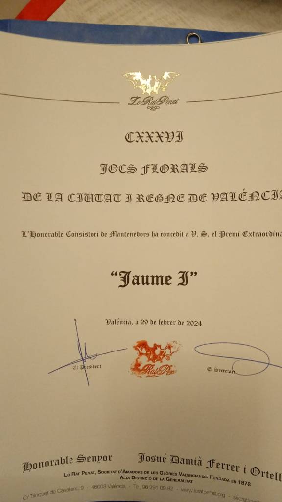 És per a mi un plaer anunciar-vos que la meua obra Anecdotario histórico y cultural valenciano ha segut guardonada en el Premi Jaume I dins dels CXXXVI Jocs Florals de la Ciutat i Regne de Valéncia que organisa Lo Rat Penat, la decana de les entitats culturals valencianistes.